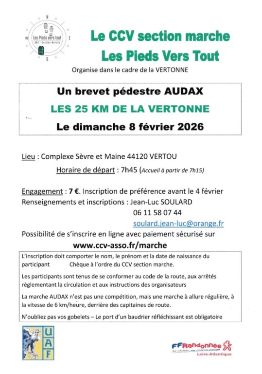Dimanche 8 février 2026 - 25 km Audax Vertou